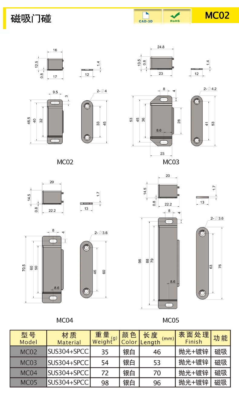 | MC05 | SUS304+SPCC | 98.01 | 96 | Silver White | Door touch door suction | download |