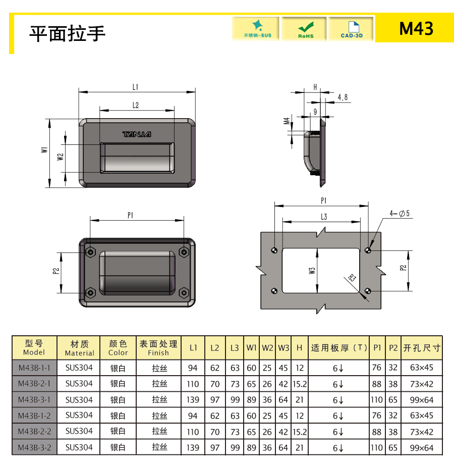 | M43B-1-1 | SUS304 | 70.01 | 94 | Silver White | Flat handle | download | ||||