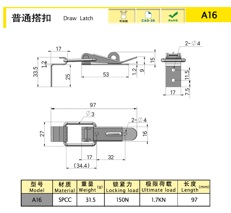 function function Length (mm) Length (mm) material quality Weight (g) Locking force (N) Locking force (N)