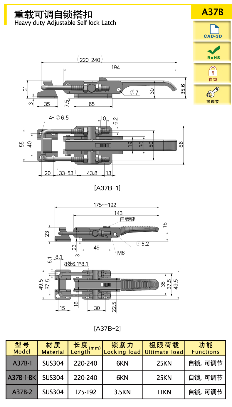 | A37B-1-BK | Self locking, adjustable | 220-240 | SUS304 | 731.53 | 6000 | 25000 | download | ||||