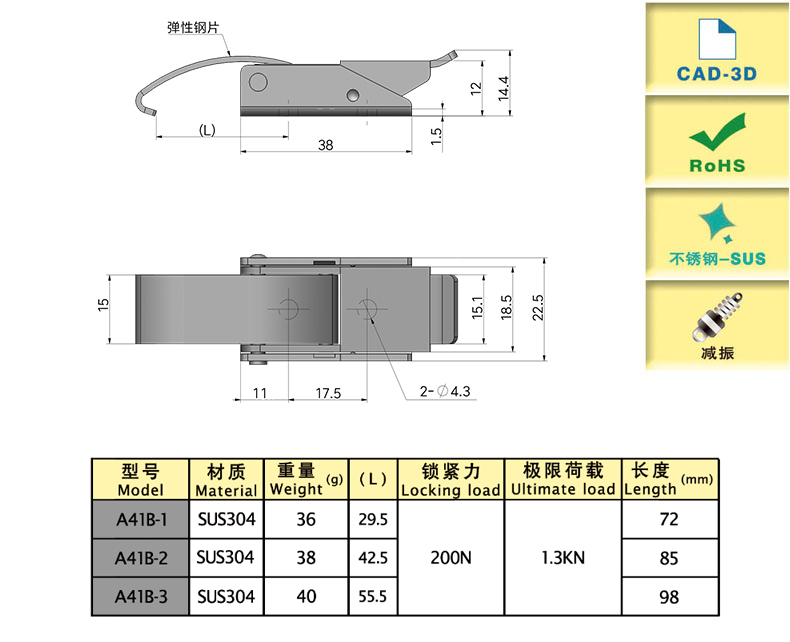 function function Length (mm) Length (mm) material quality Weight (g) Locking force (N) Locking force (N)