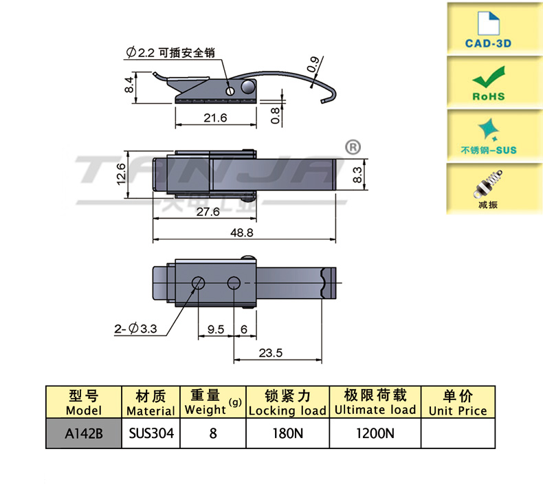 function function Length (mm) Length (mm) material quality Weight (g) Locking force (N) Locking force (N)