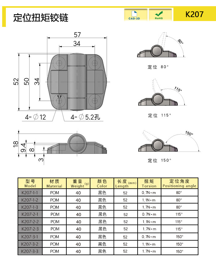 | K207-3-3-BK | POM | 52 | Black | 39.01 | Fixed torque,Angle positioning | download |