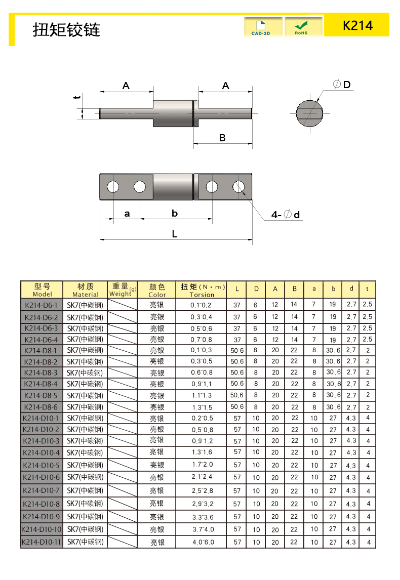 | K214-D6-4 | Carbon steel | 37 | Silver White | 100 | Fixed torque | download | ||||