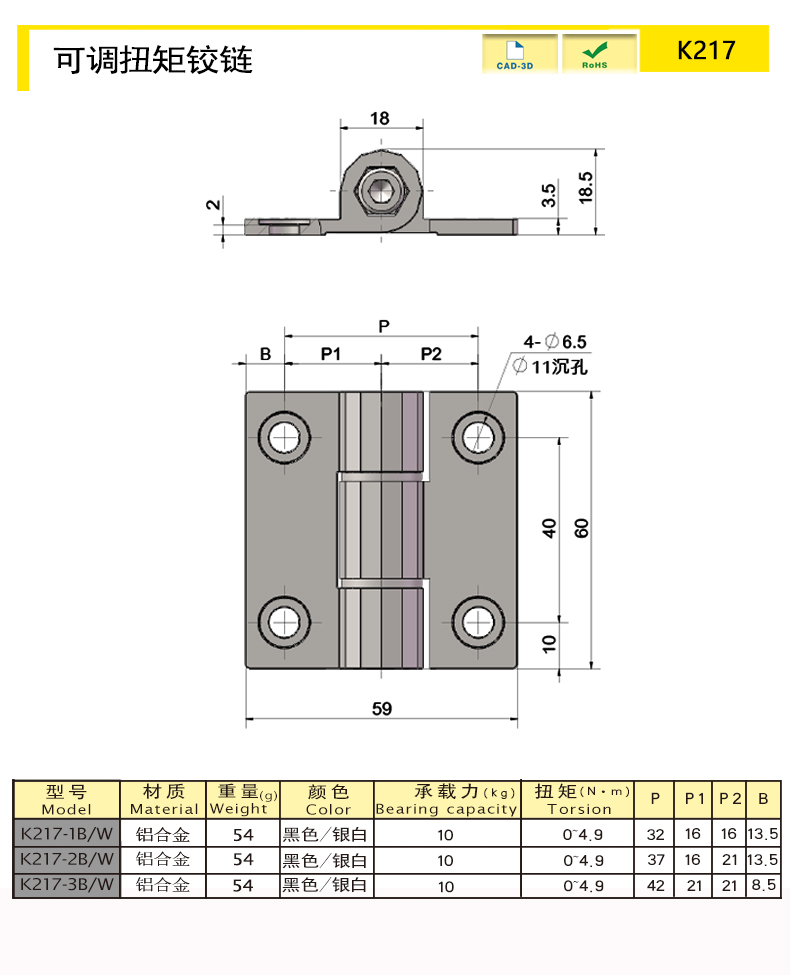 | K217-1SR | Aluminum alloy | 60 | Silver White | 69.01 | Adjustable torque | download | ||||