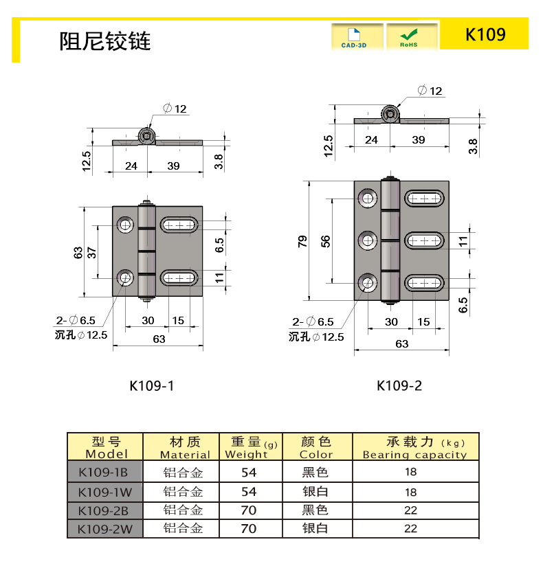 | K109-1SR | Aluminum alloy | 63 | Silver White | 51.2 | Light damping | download | ||||