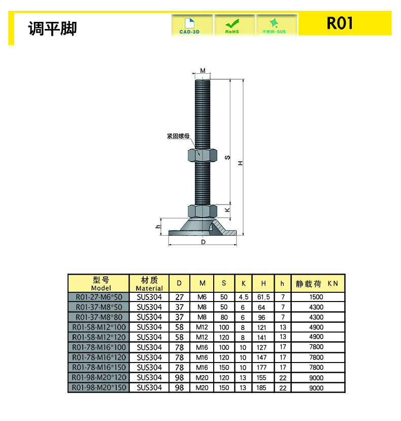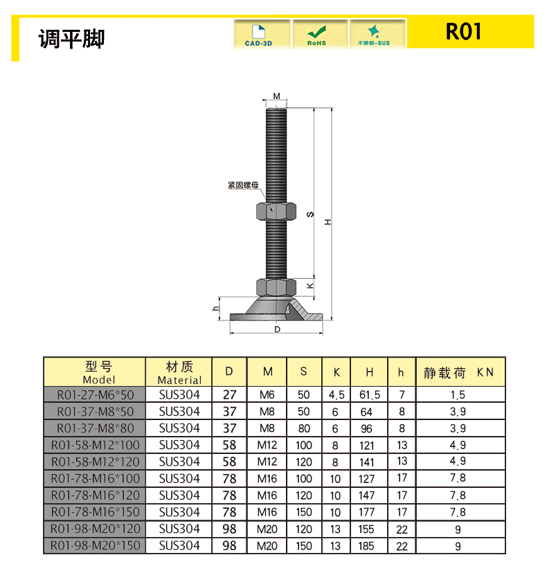 | model | material quality | Diameter D | M | S | K | H | h | Weight (g) | Static load (KN) | 3D | Purchasing | |||