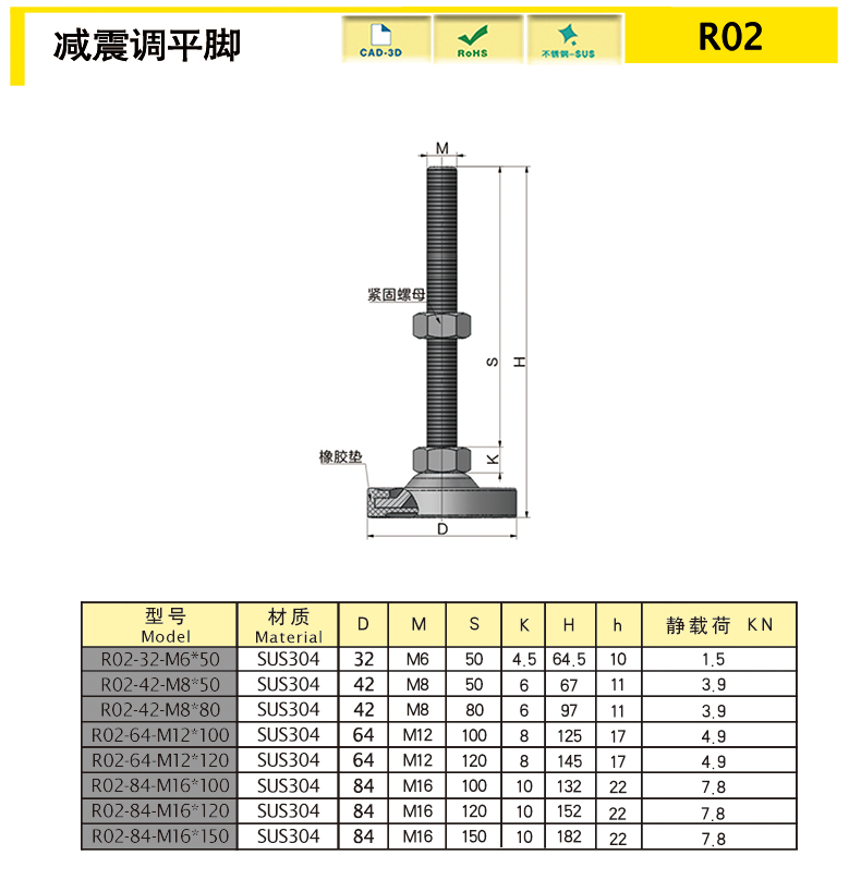 | model | material quality | Diameter D | M | S | K | H | h | Weight (g) | Static load (KN) | 3D | Purchasing | |||