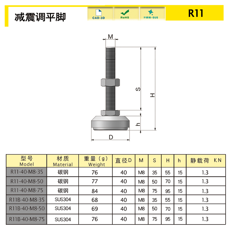 | R11ST-40-M8-50 | Carbon steel | 40 | M8 | 50 | 70 | 15 | 1 | 1.3 | download | ||||