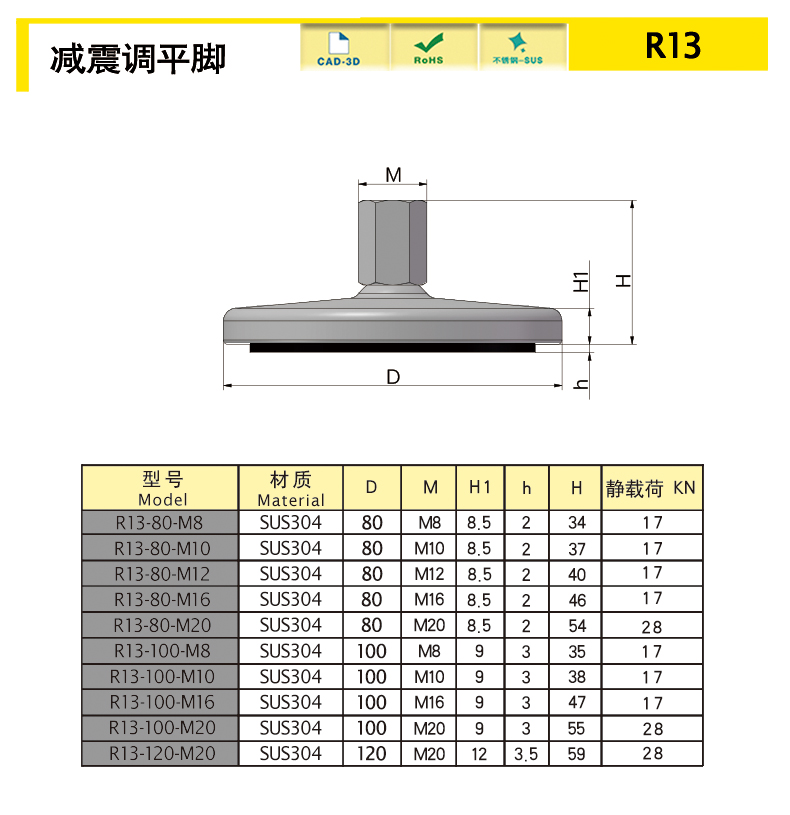 | model | material quality | Diameter D | M | H | h | H1 | Weight (g) | Static load (KN) | 3D | Purchasing | |||