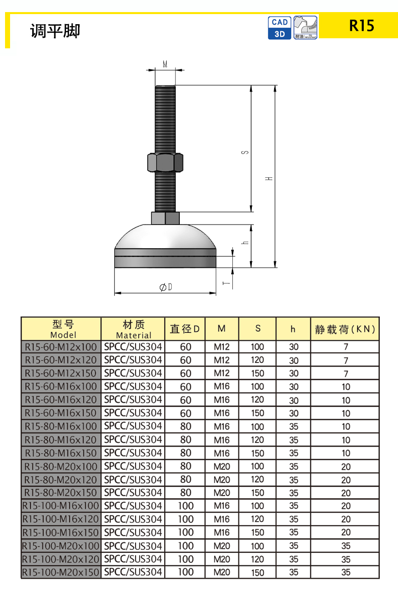 | model | material quality | Diameter D | M | S | h | Weight (g) | Static load (KN) | 3D | Purchasing | |||