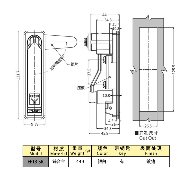 Structural function: locked by the key, the handle automatically pops up and rotates to open when pressed, and the position of the lock plate can be swapped to be universal on both sides