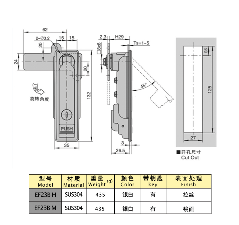 Structural function: locked by the key, the handle automatically pops up and rotates to open when pressed, and the position of the lock plate can be swapped to be universal on both sides