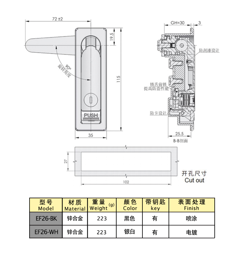 Structural function: locked by the key, the handle automatically pops up and rotates to open when pressed, and the position of the lock plate can be swapped to be universal on both sides