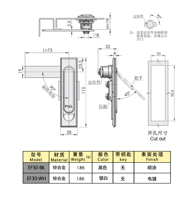 Structural function: Lift the handle and rotate it left and right to open it, reset the handle and close it. Lock plate positioning can be swapped for left and right universal use