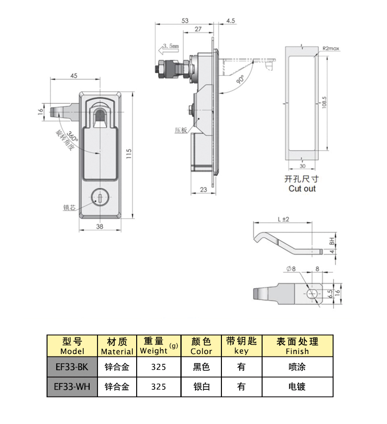 Structural function: locked by the key, the handle automatically pops up and rotates to open when pressed, and the position of the lock plate can be swapped to be universal on both sides