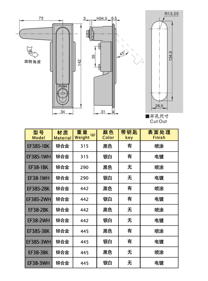 | EF38-S-3SR | Flat lock | Zinc alloy | 142 | Yes | Electroplating | 1 | download | ||||