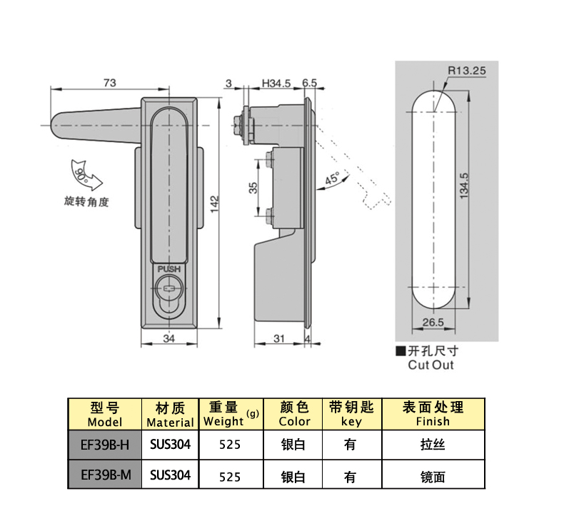 Structural function: locked by the key, the handle automatically pops up and rotates to open when pressed, and the position of the lock plate can be swapped to be universal on both sides