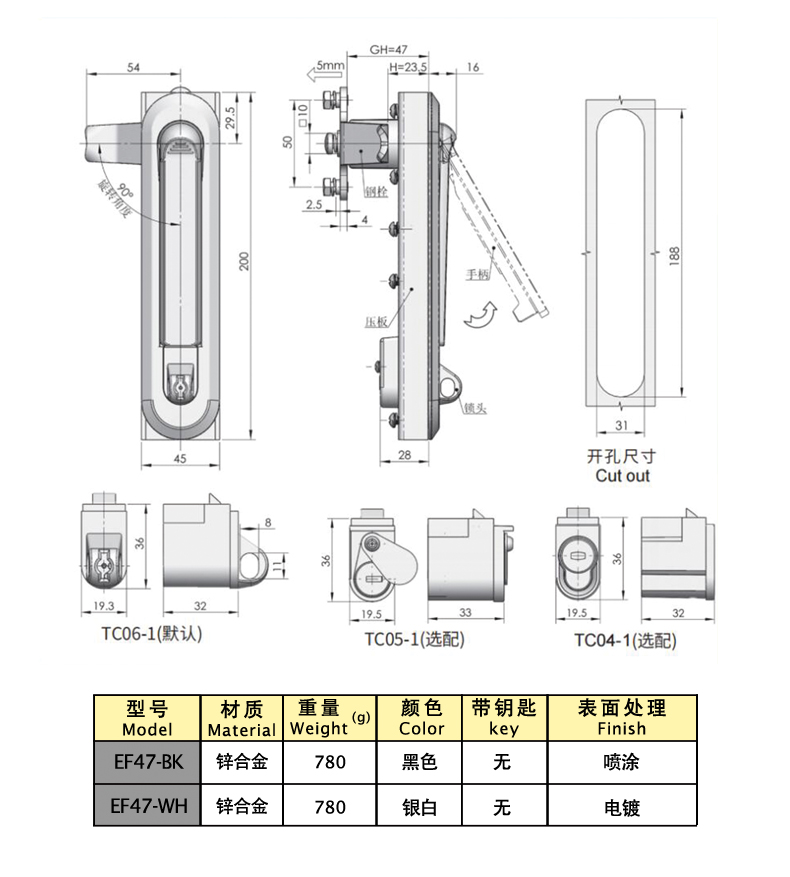 Structural function: locked by the key, the handle automatically pops up and rotates to open when pressed, and the position of the lock plate can be swapped to be universal on both sides