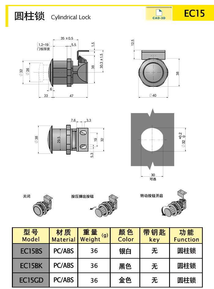 | EC15-SR | cylindrical lock | PC/ABS | Silver White | None | Chromium plating | 38.81 | download | ||||