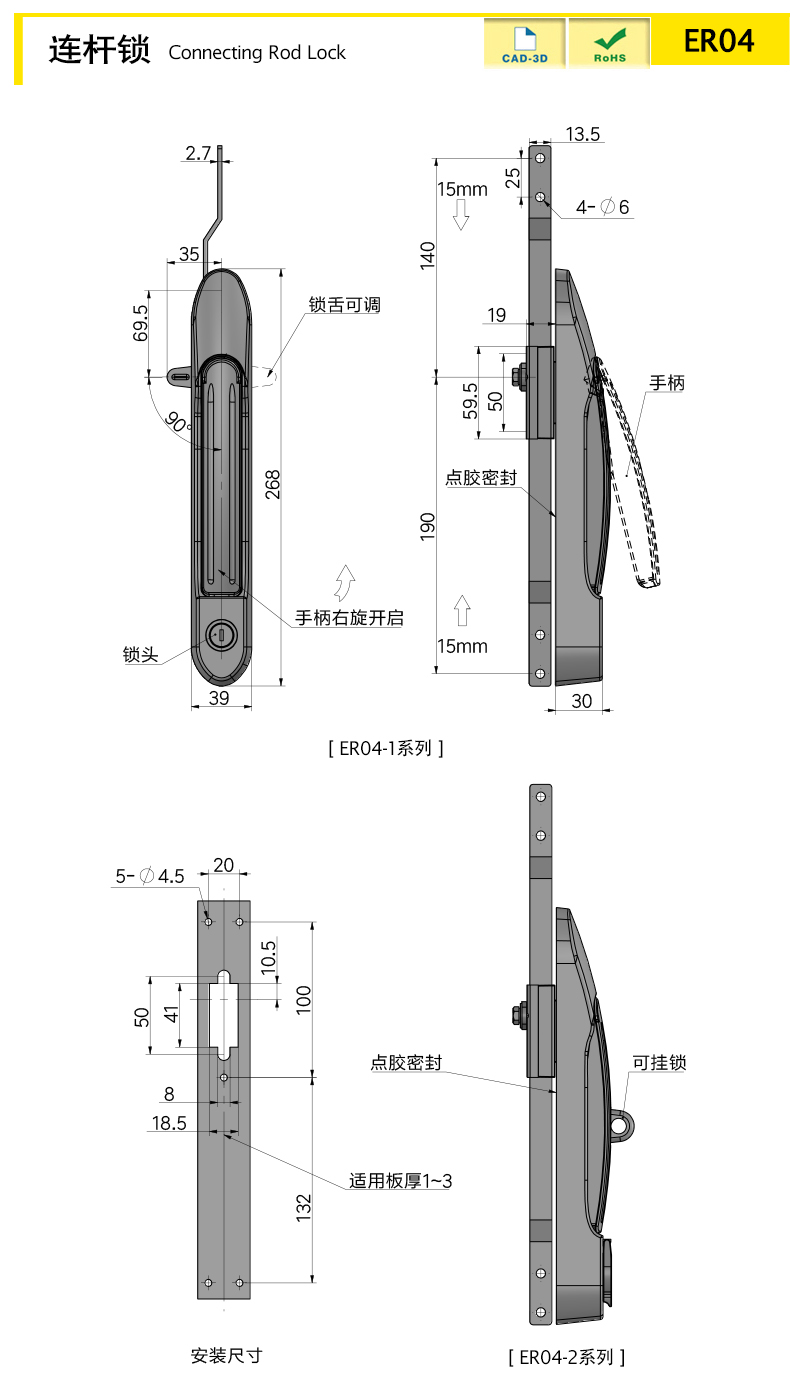Equipped with magnetic dust cover (ER04-2 series), automatic sealing; The lock body is equipped with adhesive sealing to effectively prevent foreign objects from entering, with a protection level of IP54, meeting various indoor and outdoor usage scenarios